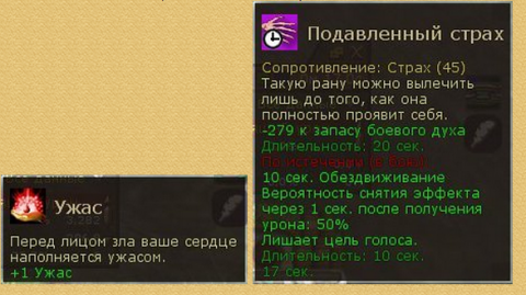 Павший духом игрок, который, однако, остался на территории Мёртвого Зубца, продолжает получать знаки схватки до тех пор, пока бегает ходя бы один живой герой. Игроки, которые покинули Зубец, получают лишь 5% знаков схваток из-за дебаффа "Страх Могильников" (Fear of the Barrows debuff) (но при выполнении любого ежедневного квеста они всё равно получат обычное количество наградных знаков схваток). Так что если вы окончательно пали духом, отступать не стоит.